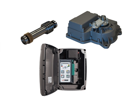 Fast irreversible gear motor, grease lubricated, with mechanical opening and closing stop. Pre-cabled wires.